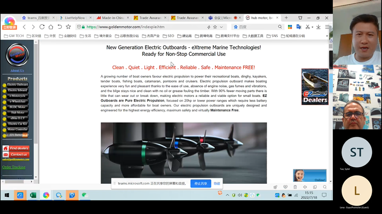 依托于26年悠久历程的专业船艇展会CIBS线下展而诞生的船艇休闲旅游在线B2B平台(XIUGLE.COM),拥有海量行业资源,已成功举行多次线上商贸配对会及一系列线上活动,为供应商匹配到优质合作伙伴,获得供应商与采购商的优良口碑。今年7月,依托XIUGLE平台,第一场聚焦于电动推进器的线上专题展成功举办。来自罗马尼亚、芬兰、土耳其的买家,成功与国内电推企业高尔登、卧龙、昊野进行了视频配对。