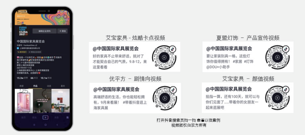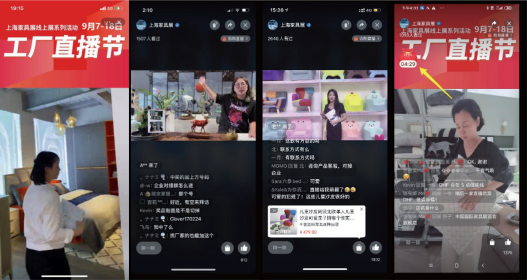 家具在线采购通小程序、上海家具展视频号、抖音号、天猫旗舰店等多平台直播,连线工厂直播,并在私域进行推广,为企业带去精准的买家线索。